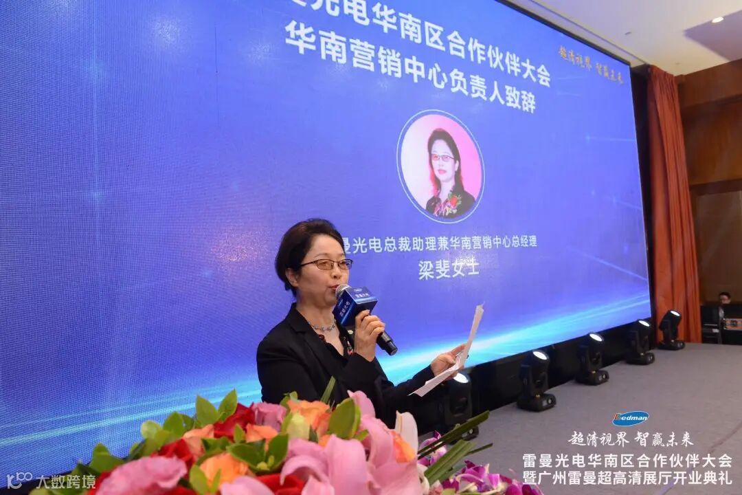 授牌仪式开始前,雷曼光电华南营销中心总经理梁斐致辞,她对远到而来的各位合作伙伴表示感谢,雷曼坚持守信创新,提升产品品质,得到众多客户的支持与认可,得以高速发展,未来雷曼将以更饱满的热情与大家迎接新的挑战,共同推动产业进步与发展、共同分享产业发展红利。