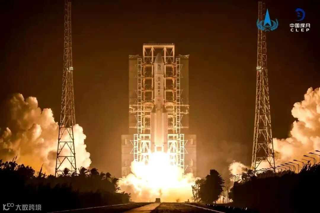 11月24日4时30分,中国文昌航天发射场,搭载嫦娥五号探测器的长征五号遥五运载火箭成功发射升空,火箭飞行约2200秒后,顺利将探测器送入预定轨道,开启我国首次地外天体采样返回之旅。(图片via中国探月)