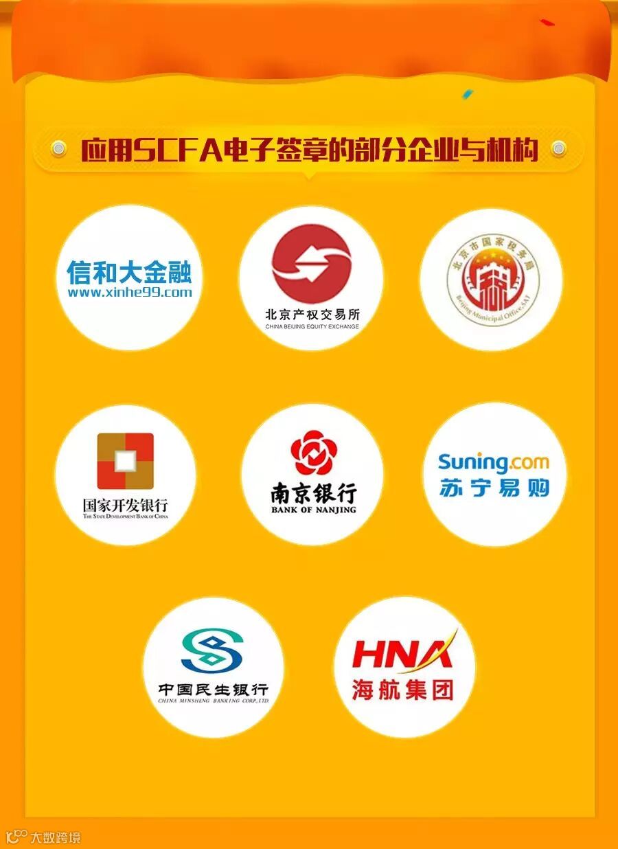 CFCA是中国人民银行和国家信息安全管理机构批准成立的国家级权威的安全认证机构,重要的国家金融信息安全基础设施之一。CFCA提供的认证被广泛应用于政府机关、银行、大企业集团,目前国内绝大多数(200多家)银行都采用了CFCA电子签章。