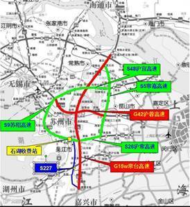 绕行线路:选择S227省道向北到石湖收费站上S26沪常高速,向东行驶至甪直枢纽处转S5常嘉高速到南通、常熟;或向西沿苏州绕城高速至相关目的地。绕行示意图: