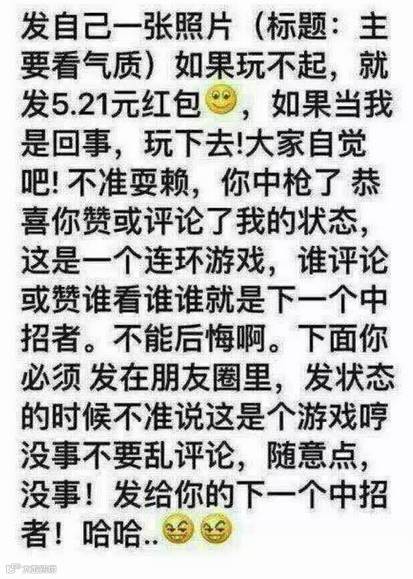 遇到这样的游戏,你是选择发照片还是选择发红包呢?当然发照片了,不仅可以节省5块钱,还能坑更多的小伙伴啊!原来,为了在当前经济环境下握紧红包,坚决节约5元钱,才有了接下来你知道的了,满屏的“主要看气质”。