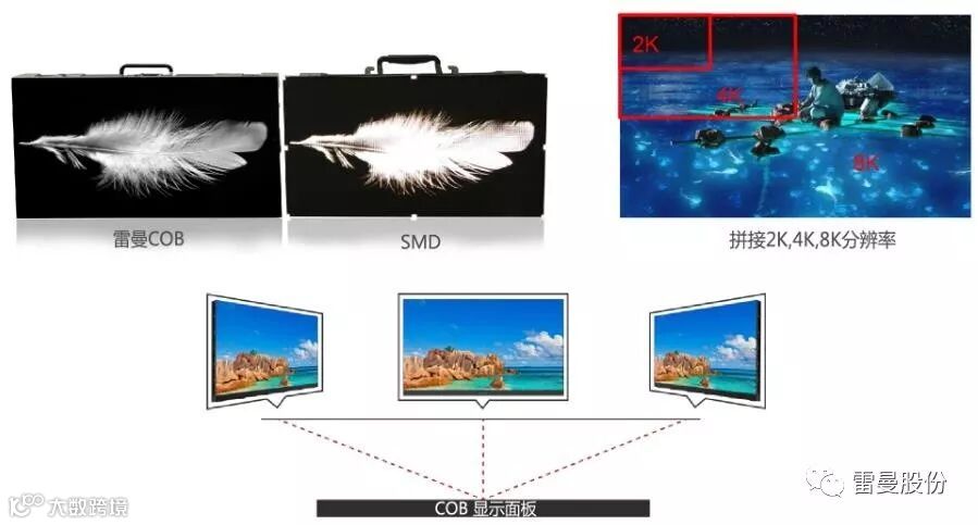 雷曼光电小间距COB高清显示面板采用COB(Chip On Board)的形式,即将LED裸晶芯片用导电胶(R)或绝缘胶(G、B)固定在PCB的灯位焊盘上,然后用超声波焊接技术对LED 芯片进行导电功能引线焊合,最后用环氧树脂胶或硅树脂对灯位进行包封,保护好LED 发光芯片和引线。COB 封装工艺整合了LED 显示产业链的中、下游企业的生产流程,在一个企业内部就可完成从LED 灯珠的封装到LED 显示屏的制作过程,节约了生产组织成本,中间环节的包装和物流成本、质量控制成本等。该产品是雷曼光电结合先进LED 集成封装技术、LED 智能显示控制技术及一系列工艺突破,自主研发的高端LED 显示产品,具有高密度、高可靠性、高对比度、高灰度、高分辨率、高防护等级、低使用成本等优点,是公司注重科技创新,厚积薄发的创新成果,适合广泛应用于监控中心、指挥中心、会议显示、商用显示等众多大屏幕高清显示领域。