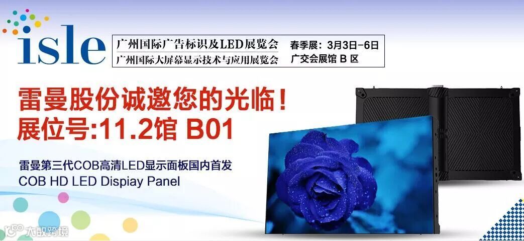 春暖花开新气象。2018年3月3-6日,2018广州国际广告标识及LED展览会暨2018广州国际大屏幕显示技术与应用展览会(以下简称:广州ISLE展)将在广州广交会展馆B区盛大举行。作为LED行业国内开年后的第一个大展,雷曼光电将携第三代COB小间距LED显示面板精彩亮相。