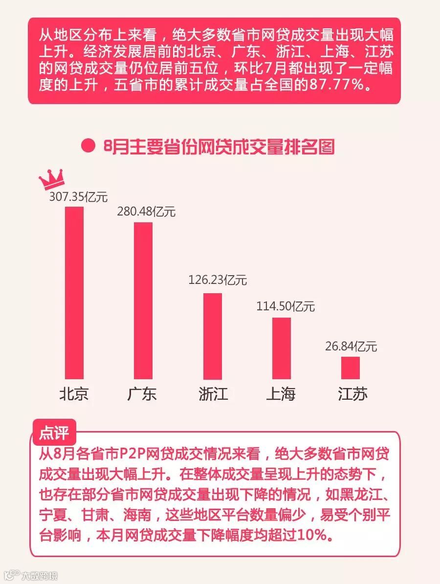 受经济下行压力影响,宽松的货币政策持续推行,央行于8月26日起实行“降准”,同时伴随着以余额宝为首的货币型基金年化收益率跌至3.5%以下,上半年风光无限的股票市场积弱难返的背景下,网贷人气进一步的攀升,由于P2P网贷在收益率方面占据一定优势,能够进一步吸引更多的投资人加入进来,因此P2P网贷行业成交量有望继续增长!