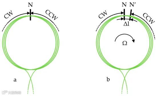 在萨格纳克效应中,光在环形光路中的传播过程与这一过程完全类似。顺、逆时针传播的两束光虽然沿相同的几何路径传播,但由于探测位置在光传播过程中随系统转动,导致两束光到达探测器的时间不同,从而产生相位差。