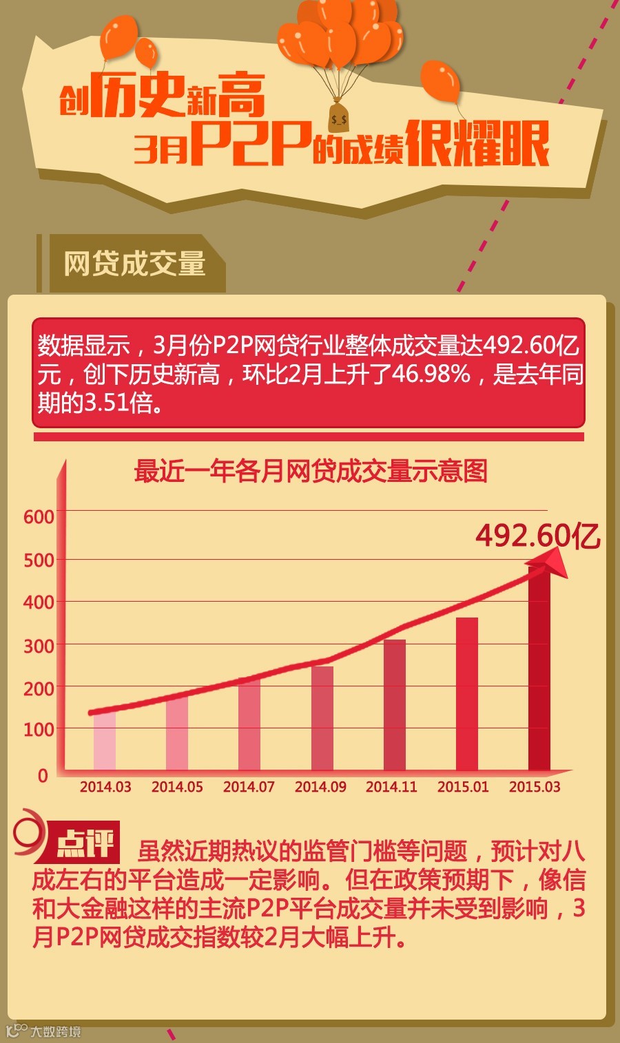 4月1日,网贷之家发布了《中国P2P网贷行业2015年3月月报》。就在刚刚过去的3月份,P2P网贷行业整体成交量高达492.60亿元,创下历史新高!