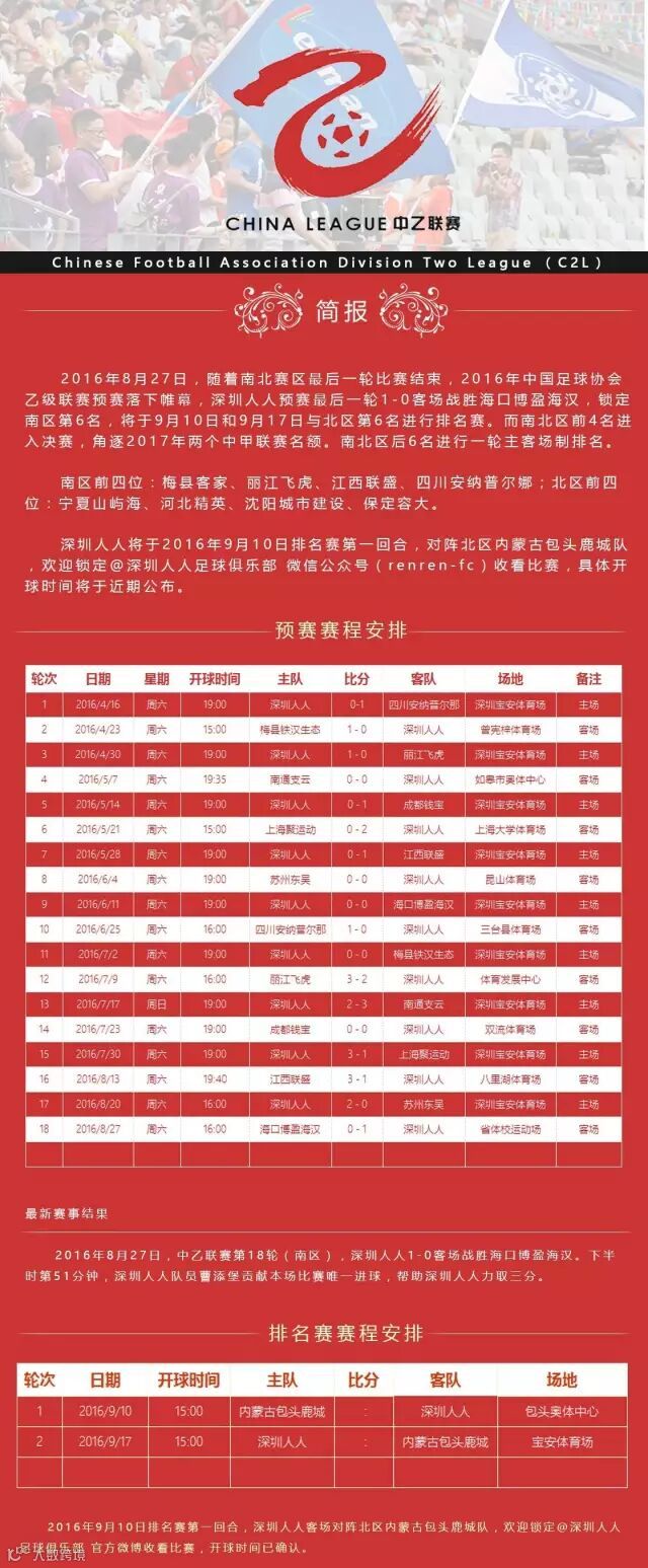 《2016中国足球协会乙级联赛》深圳人人完整对阵日程表