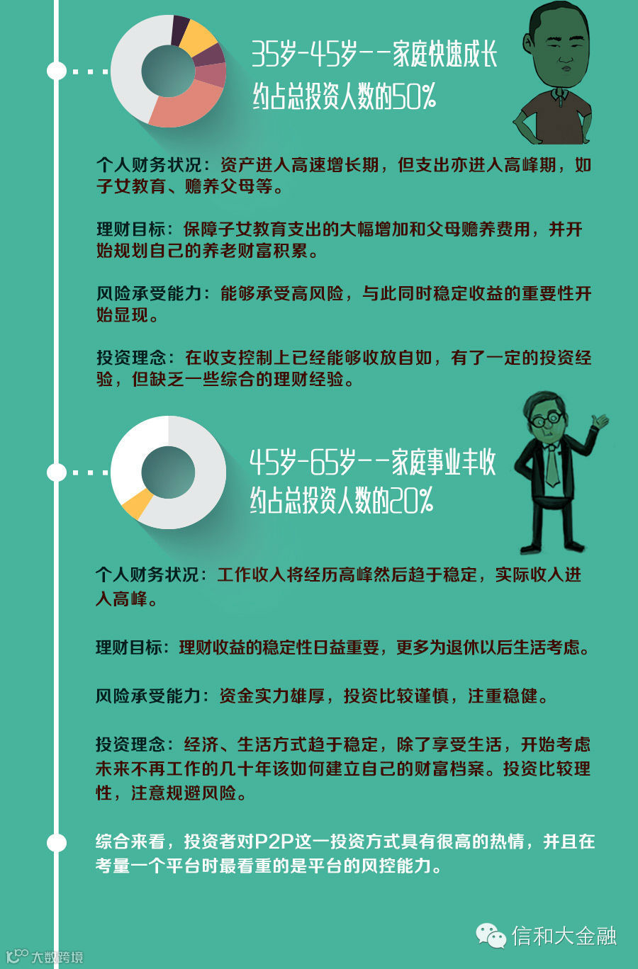 信和大金融统计发现了一个有趣现象,P2P平均投资金额随着年龄稳步增长,40岁以上的中老年人已经成为P2P的重要投资人群。