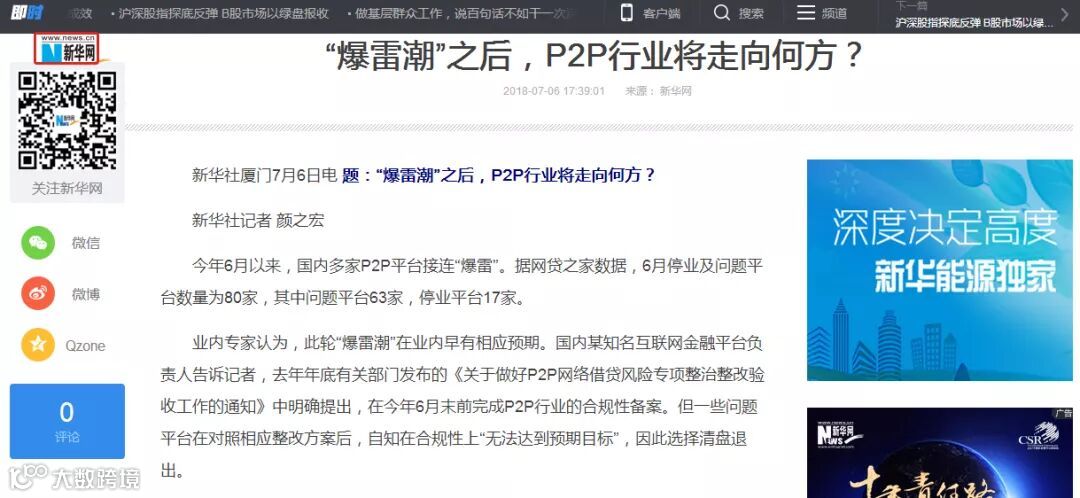 新华网发表原题为“‘爆雷潮’之后,P2P行业将走向何方?”的文章