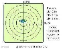 目前,格洛纳斯的定位精度有了很大提高,dL = 0.6m,dB = 2.1m,dH = 6.6m, HDOP = 0.9, PDOP = 1.9,GDOP = 2.2,见下图数据: