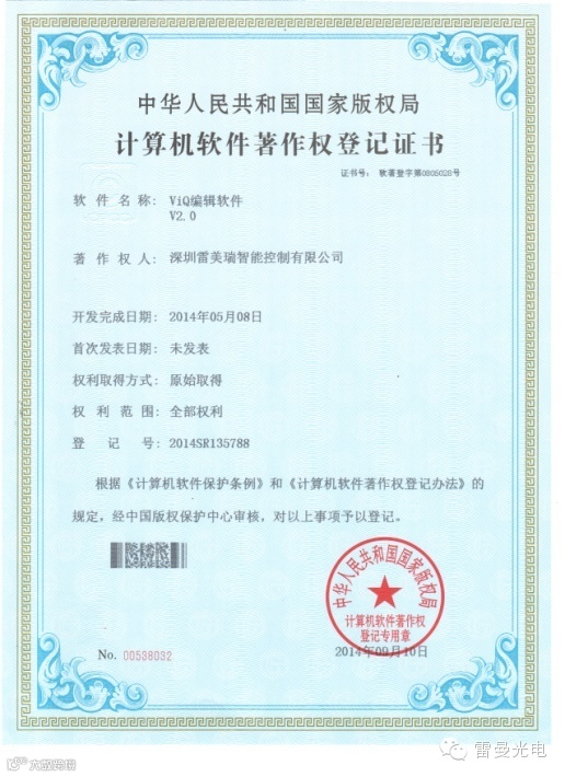 经中华人民共和国国家版权局考证,根据《中华人民共和国计算机软件保护条例》和《计算机软件著作权登记办法》的规定,近日,雷曼光电子公司雷美瑞智能控制有限公司被认定为软件《ViQII LED 模组智能监控嵌入式系统》、《ViQ设置软件》和《ViQ编辑软件》的法定著作权人,并于2014年09月10日被正式授予《中华人民共和国国家版权局计算机软件著作权登记证书》,登记号分别为:2014SR135786、2014SR135774、2014SR135788。即日起,其版权将得到“中国版权保护中心”的有效保护。