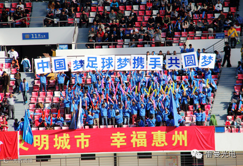 下午15:00比赛正式开始,现场人声鼎沸、热闹非凡。位于观众席11区200名身着蓝色活动服的雷曼方阵格外引人注目。高举的条幅“雷曼光电祝粤港健儿勇夺佳绩”表达了雷曼人对此次比赛的美好祝愿,而双面助威看板“雷曼光电为中国足球加油”、“中国梦 足球梦 携手共圆梦”更是体现了雷曼人对中国足球的高度关注与祝福。鼓点声声、助威棒高舞,整齐划一的口号与动作,更是感染了现场观众。当运动员进场时,雷曼人摇旗呐喊“春风吹、战鼓擂,省港健儿谁怕谁”的口号迎接球员们。而比赛过程中绿茵场上广东队与香港队进行着激烈的拼抢,观众席上呐喊声、欢呼声此起彼伏。雷曼人用特有的激情为广东、香港运动员加油,为中国足球加油。
