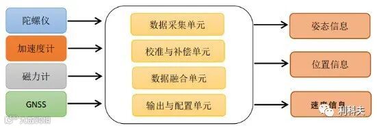 下图是组合导航系统的一个基本的框图,它以加速度计、陀螺仪、磁力计、气压计、GNSS等作为基本输入,利用融合算法输出用户所需要的姿态信息、位置信息以及速度信息。