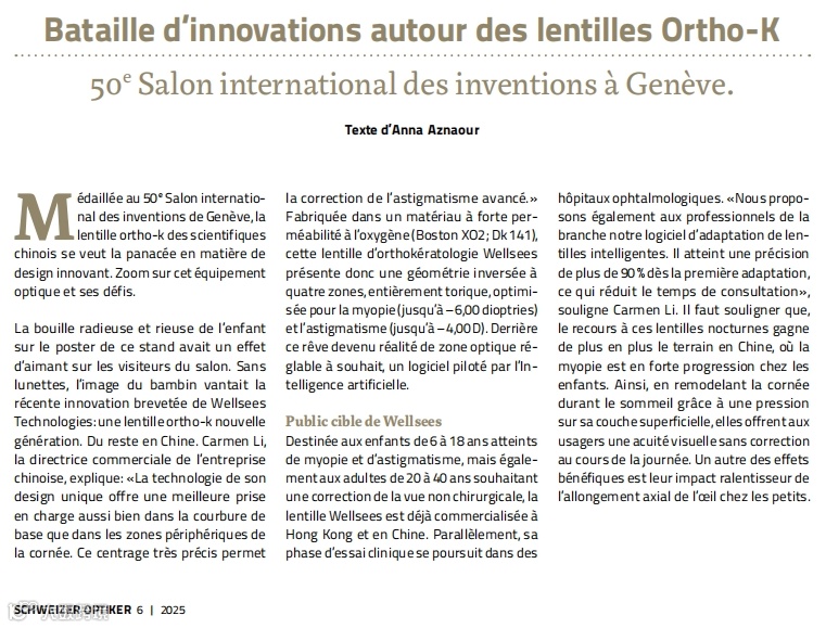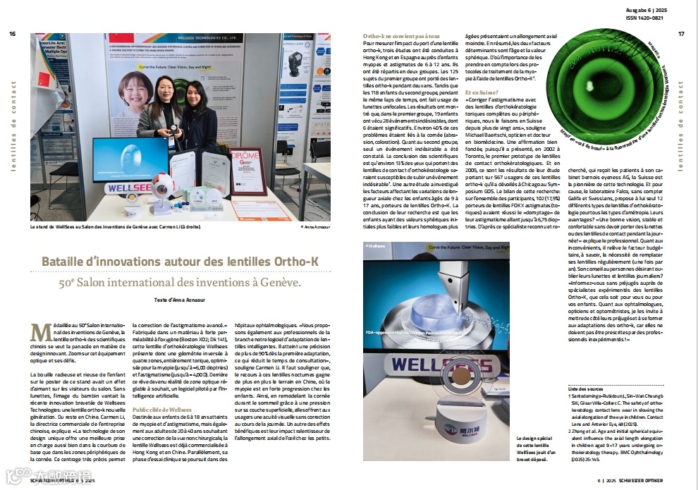 近日,瑞士知名眼镜零售行业媒体Schweizer Optiker对我司创新OK镜产品进行了专题报道,再次肯定了我司OK镜产品创新性和应用前景。报道中特别强调,我司OK镜凭借突破性设计与显著的近视防控效能,于今年4月举办的第50届日内瓦国际发明展(International Exhibition of Inventions of Geneva)中脱颖而出。