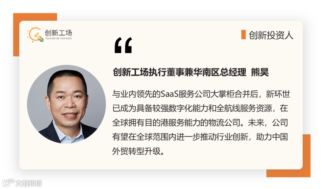 创新工场执行董事兼华南区总经理熊昊表示,全球国际货代市场规模超万亿元,在中国供应链走向全球的浪潮中,有望涌现出中国本土的头部货代公司。与业内领先的SaaS服务公司大掌柜合并后,新环世已成为具备较强数字化能力和全航线服务资源,在全球拥有目的港服务能力的物流公司。未来,公司有望在全球范围内进一步推动行业创新,助力中国外贸转型升级。