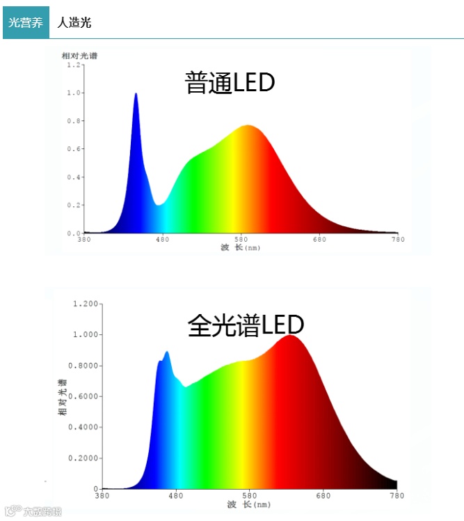 在没有阳光的时候,改造环境灯光和台灯显得尤为重要,努力让人造光源向太阳光方向发展,更有“光营养”。上图中显示的是普通的LED,全光谱LED和功能性光谱LED的相对光谱,可以看到差距还是蛮大的。对于LED灯的亮度配置上,以往的标准可能有些落后,我们建议每平方米应该达到7W。