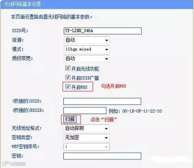 2、打开路由器B的无线基本设置,勾选WDS,然后扫描到第一台路由器.