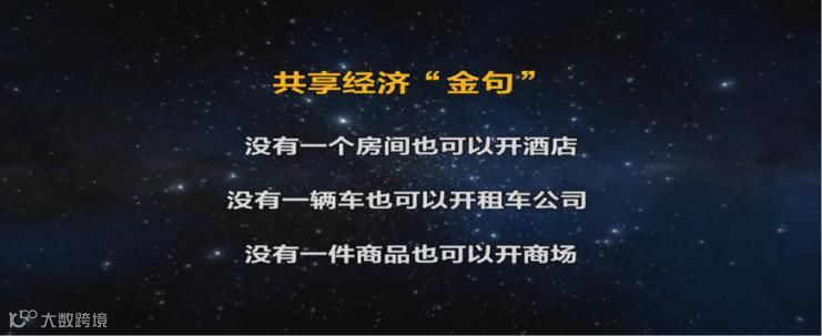 “共享经济”金句NO1:“没有一个房间也可以开酒店,没有一辆车也可以开租车公司,没有一件商品也可以开商场。”「共享经济」之风在中国始于滴滴,兴于单车。滴滴在诞生4年后涌入全球独角兽排行榜第三;共享单车领域ofo和摩拜也在经过资本竞赛后估值超过10亿美金。