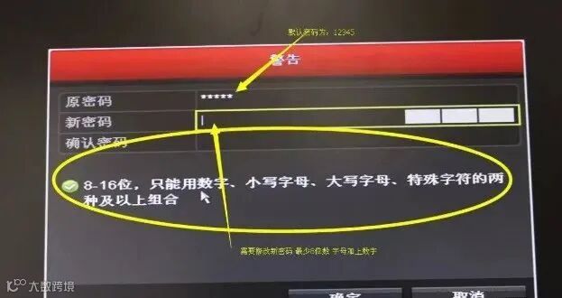 9、管理员默认原密码为 12345,修改新密码最少8位数,必须包含字母加上数字,最高16位。密码设置完成以后硬盘录像机将会自动激活。