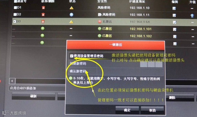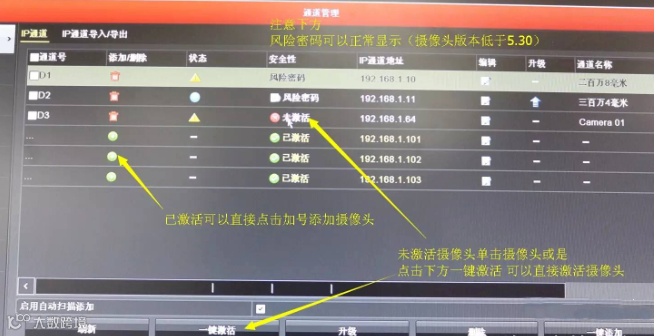 11、请注意下图文字表示,已激活摄像头必须要跟硬盘录像机密码一致,未激活摄像头点击摄像头或是点击一键激活,即可激活摄像头。