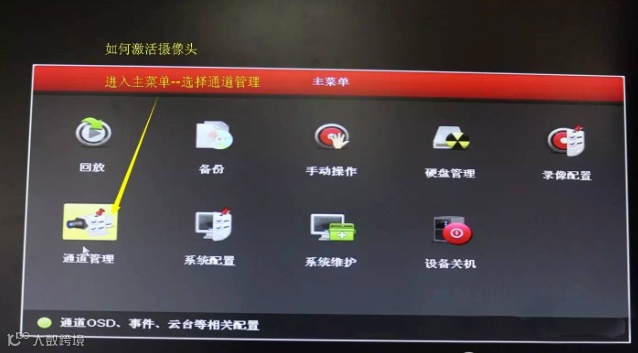 10、如何添加未激活的摄像头,进入主菜单选择通道管理。