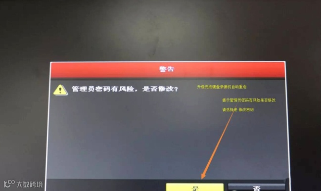 8、系统重启以后需要强制修改硬盘录像机管理员密码,下图界面请点击是,进行修改密码操作。
