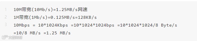 我们申请的带宽是10Mb/s这个单位中的b是小写的,而我们刚才说的1B(字节)=8b(位),这里刚好是8倍的关系,即下载速度:10Mb / 8 = 1.25MB