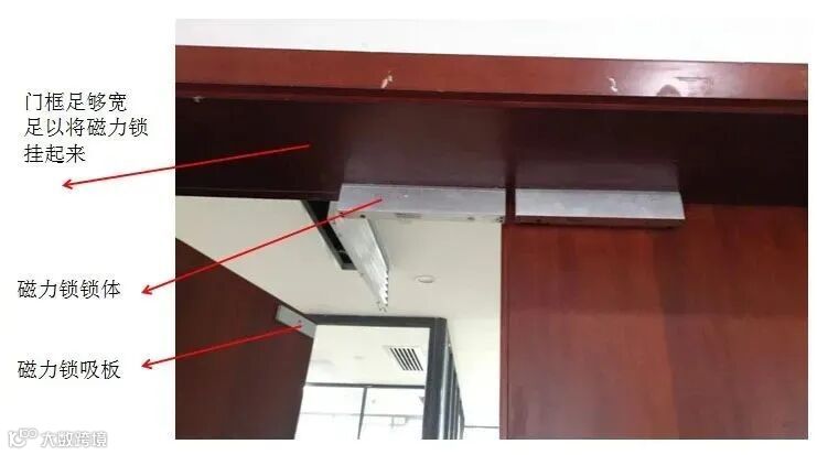 磁力锁在玻璃门上的挂式安装,门框够宽,无需支架。