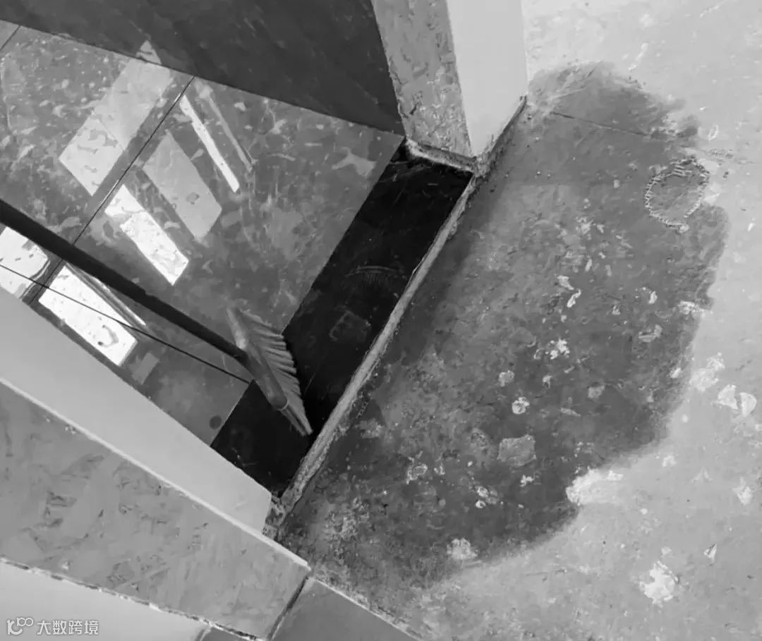 上图就是门槛石防水没有做好,导致卫生间的水从门槛石的底部渗透到了外面,虽然外面还是毛坯,没有铺地板,如果铺了地板,后果不堪设想。