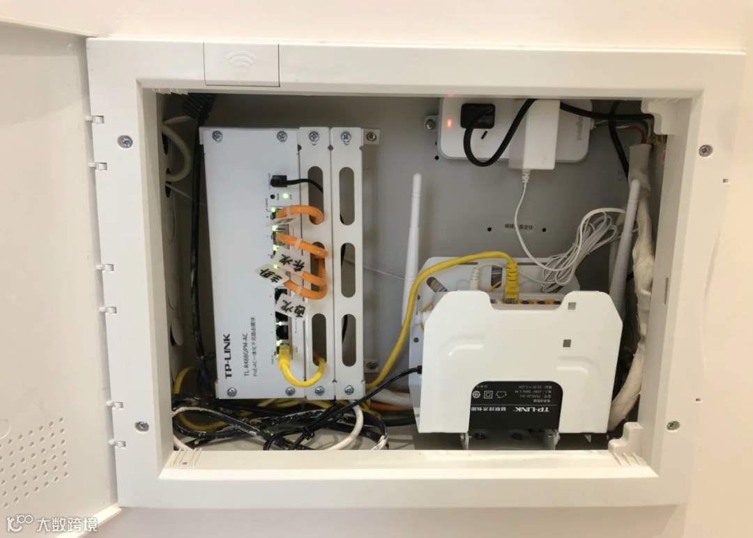 另外一种方式,如果弱电箱比较小,容纳不下这么多设备,可以考虑把主路由器放在其他的空间(随便哪一个空间,爱放哪儿放哪儿,一般放在客厅或者书房),这种方式需要新增加一个交换机,放在弱电箱里。