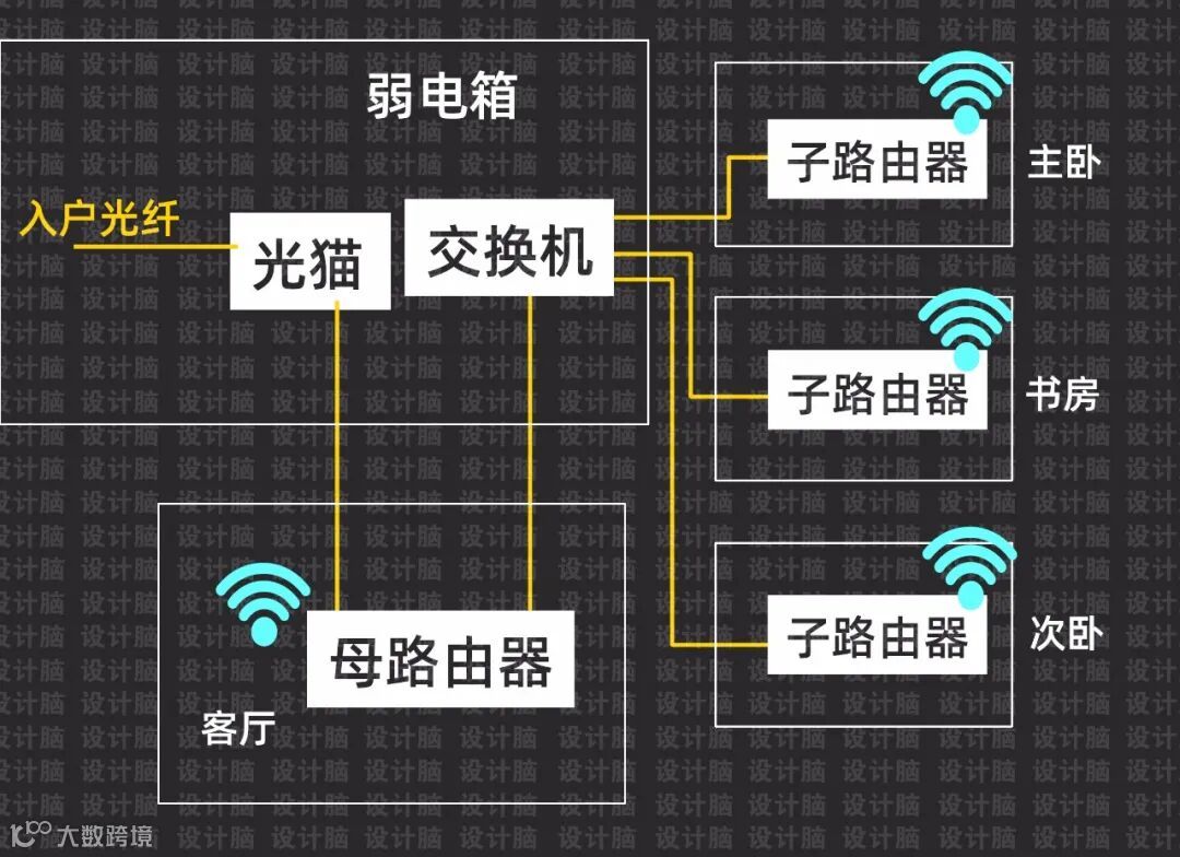 组网逻辑是这样的:入户光纤接入光猫的千兆口,再从光猫接出网线连接到母路由器上,再从母路由器上接出网线返回到弱电箱里的交换机,再从交换机接出网线,连接到其他空间的子路由器。这种方式非常适合空间面积特别大的,比如平层或者别墅等大户空间。从交换机就可以拉出网线接到二楼三楼四楼等等,实现全屋的WIFI全覆盖。