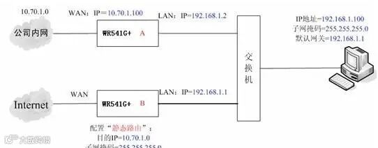 在一个公司网络中,需要不仅可以通过无线路由器B连接外网,还可以通过无线路由器A来连接公司内网服务器。在不修改本地连接的IP地址及网关情况下,公司电脑需要能够同时访问外网和内网服务器。配置实例如下图: