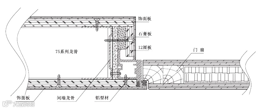 2)推拉式隐形门:常用在厨房门洞过窄的情况。节点图示意如下。如果厨房是双推门两侧都可以做成如下图结构。平时不用的时候推