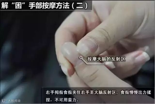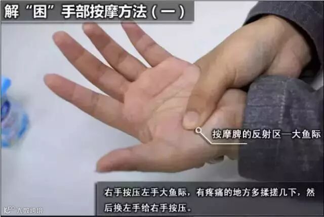做法:右手大拇指按压左手大拇指骨下掌面隆起的像鸡腿肉的这块区域,称作大鱼际,也是脾的反射区。先按左手,再按右手。按摩的方法很简单,拇指按下去后轻揉每个地方,感觉痛的地方可以多揉。选择这个部位是脾的经脉的穴位,按压感觉到疼就起到活血化淤、促进血液循环的作用,使脾发挥运送营养的功能,改善打瞌睡这一方面的症状。