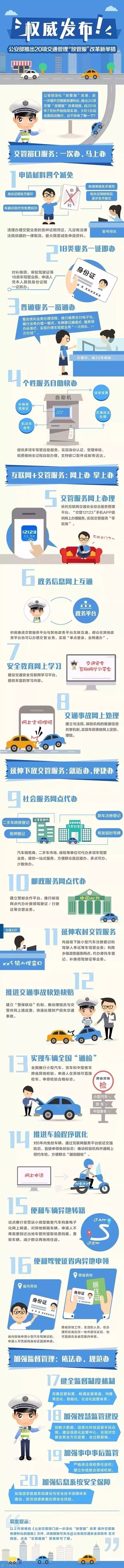 公安部深化公安改革陆续推出了一系列便民利民措施。要求全国公安机关要始终坚持以人民为中心的发展思想,深入推进“放管服”改革,切实抓好“马上办、网上办、就近办、一次办”等审批服务便民化,为人民群众提供更好更优质的服务。为进一步深化公安交通管理“放管服”改革,公安部交通管理局组织专门力量进行专题调研,在充分梳理企业和群众需求、吸收全国两会代表建议委员提案相关内容、总结各地成熟做法基础上,集中推出4方面20项交通管理“放管服”改革新措施。