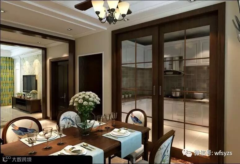 餐厅:美式风格餐厅和卫生间采用半开放式的形式,强调出并扩大餐厅空间的所属范围。粗犷、大气的美式餐桌椅,让人迷失在时光隧道中。