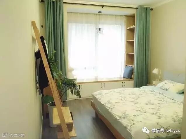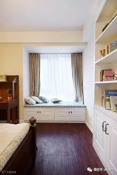 如果窗户离两边墙面还有一定的距离,可以定做一个一体式的储物柜+矮柜,既增加了巨大的储物空间,也更像飘窗的样子。
