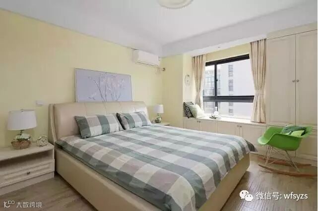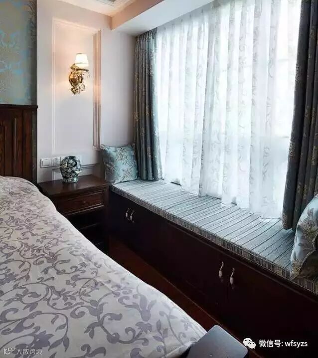卧室的窗户比较大,冬夏季的隔热保温功能就比较差。所以可以在飘窗外装一层窗纱,里面装一层较厚的遮光窗帘。白天如果坐在这看书,只拉上窗纱,不会影响看书的光线;