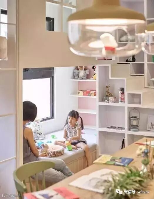 也可以作为一个儿童游戏区,旁边的置物柜放些孩子的童书、玩具,平时在这里陪孩子做做游戏,也能增长彼此的感情。