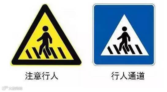 这两个不管是图案和意义都是差不多的,主要是提醒注意行人,黄底的一般是行人比较多的地方,但是不一定有人行横道。白底的那个是前方有人行横道,注意有行人。