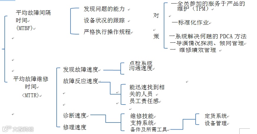 3)企业设备的保养与预防性维护。全部产品作业线设备实施维护保养手段与预防性维护活动,其维护保养的周期和时间,由掌控设备状态的管理者定期安排更新,不断提高维护保养水平,设备操作人员经常有日常清洁、检查和保养设备的良好习惯,现场设备上,要标示并严格遵循预防性維护流程、根据情况及时调整需求和程序并实施动态管理;对全部89%的没有明显使用寿命的设备,在按企业产品经营的总成本计算设备成本效益时,可以使用状态监测,由预防性维修进入到预知性维修,对产品作业线上的关键设备,全部跟踪并计算MTBF和MTTR,详见图: