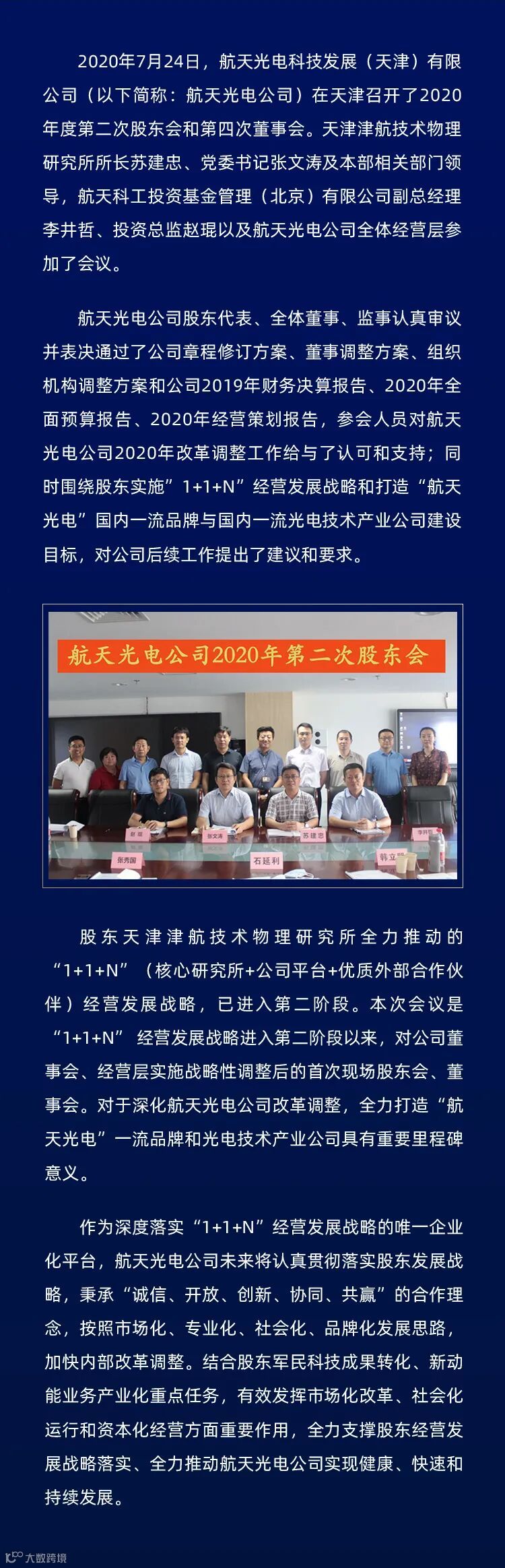 导读:2020年7月24日,航天光电科技发展(天津)有限公司在天津召开了2020年度第二次股东会和第四次董事会。