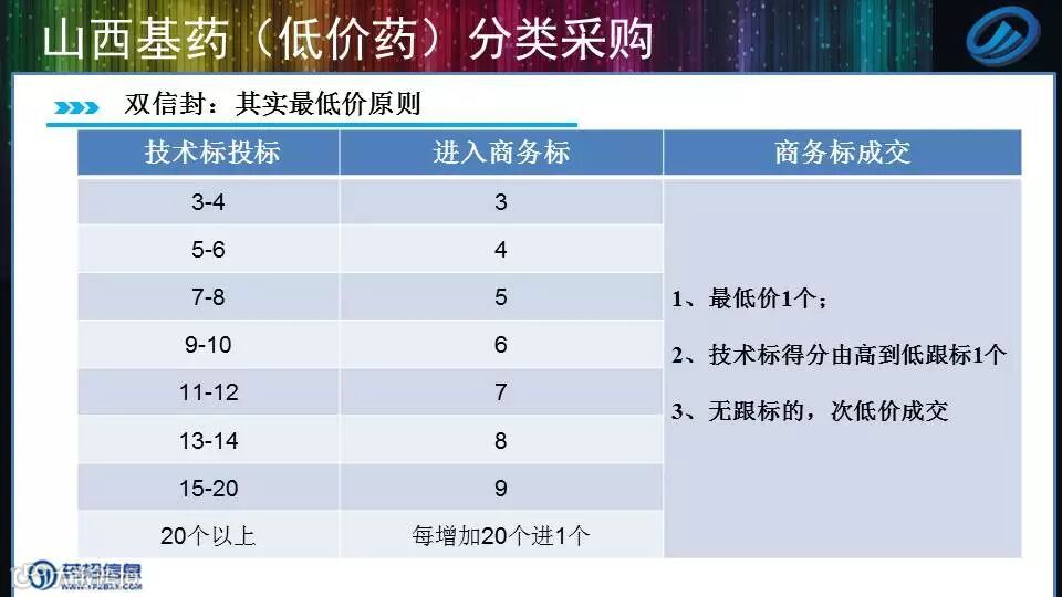 除了低价药按技术标成交前10名外;最主要就是基药的双信封了,而双信封则优先成交最低价1个,然后按技术标得分从高到低“跟标”,注意跟标是要接受最低价价格的哦。