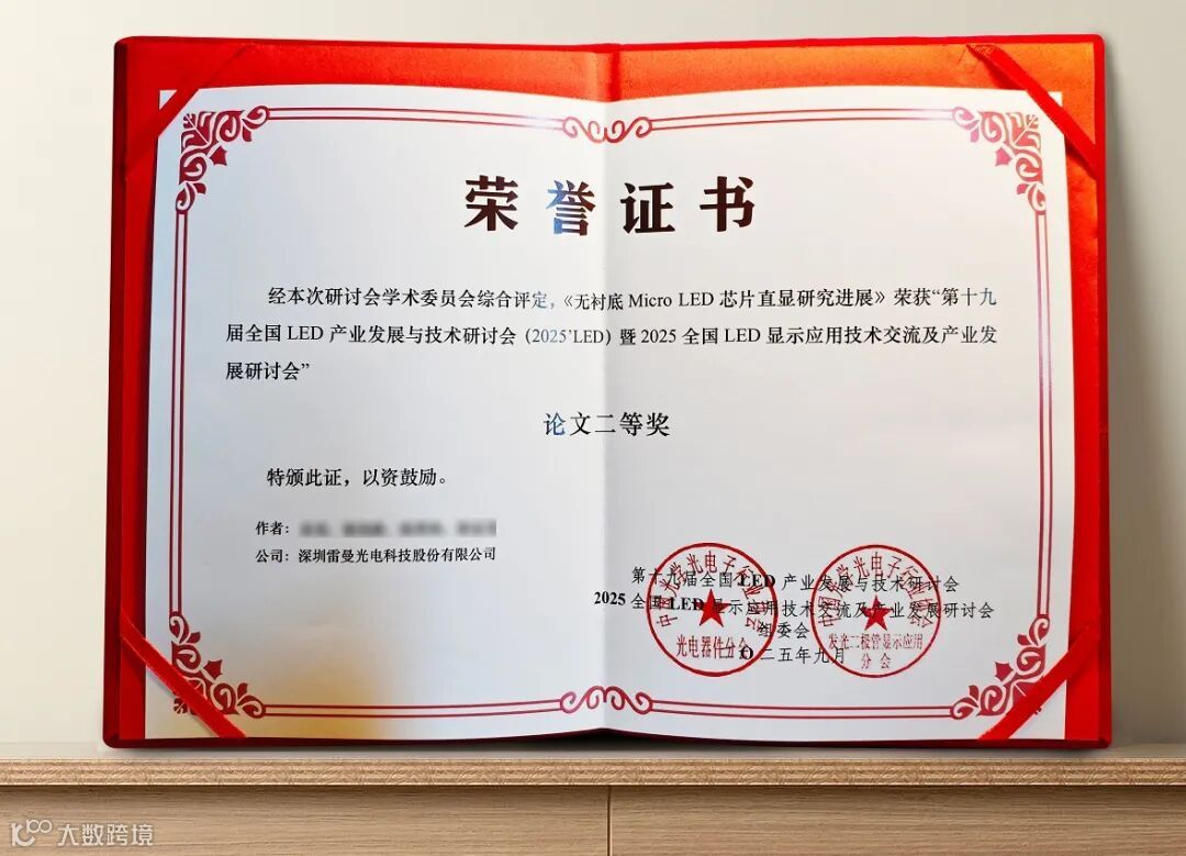 雷曼光电凭借《无衬底 Micro LED 芯片直显研究进展》技术论文,获评本次大会“论文二等奖”,同时于会上发表主题演讲。随着无衬底Micro LED芯片的性价比持续引发行业关注,此次演讲围绕MiP器件封装、PM玻璃基板封装和AM玻璃基板封装三大方向,系统介绍了无衬底Micro LED芯片在直显领域的应用进展。