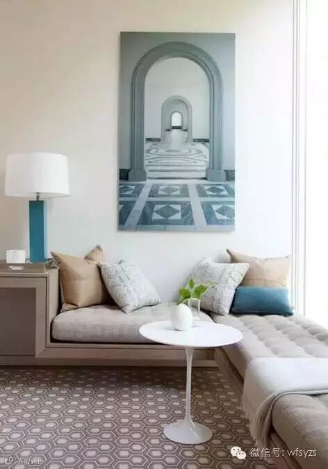 面积不大的飘窗空间装饰都不会太过于复杂,放自己喜欢的垫子,搭配自己喜欢的艺术品或花艺点缀。