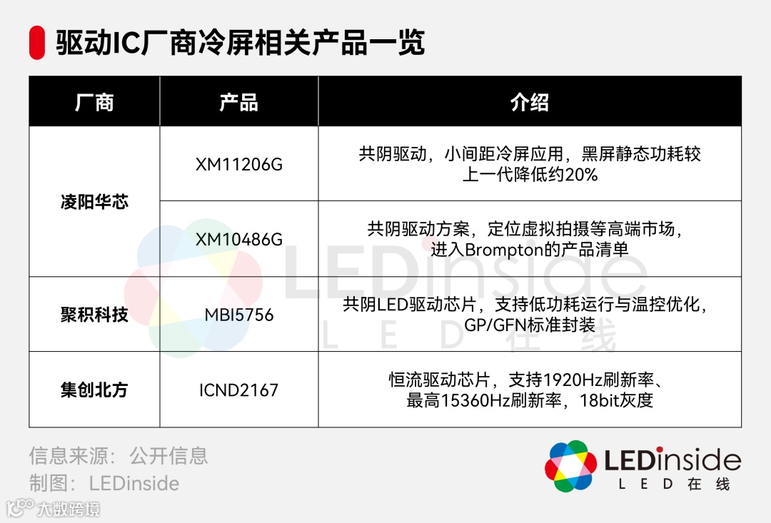 在冷屏技术体系中,节能与性能兼顾的驱动IC通常采用高集成度设计,并结合共阴驱动架构,以降低系统功耗和发热。在这一技术方向上,主流驱动IC厂商均已展开布局,部分例子如下:
