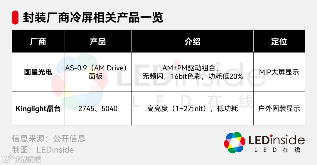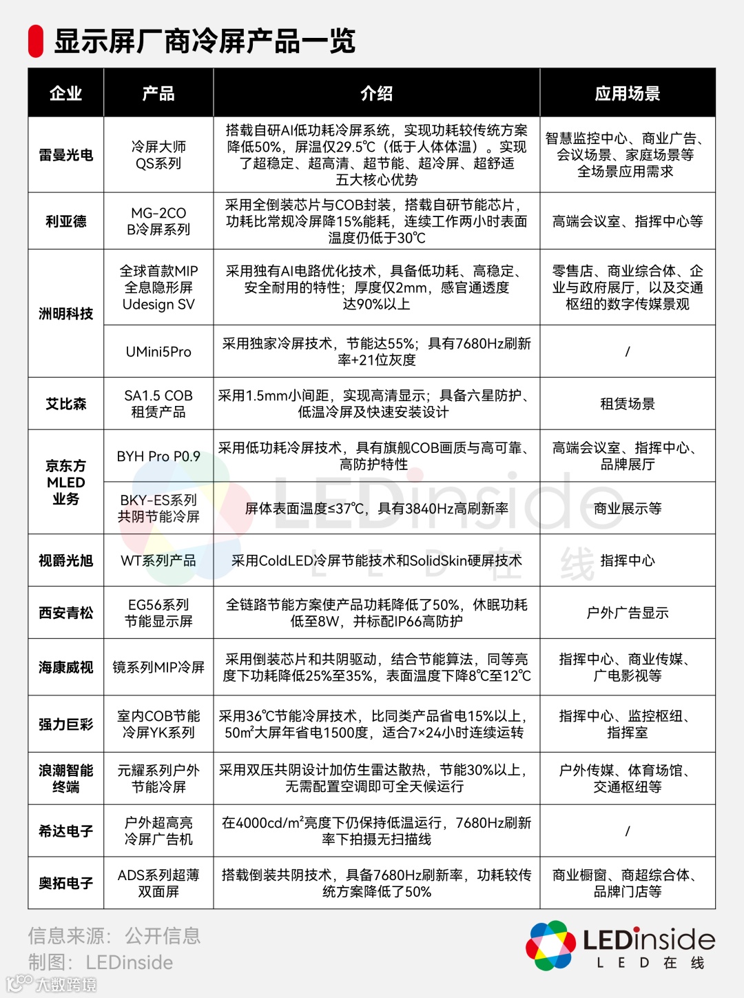 目前,国内LED厂商纷纷加快冷屏产品布局,其中包括雷曼光电、利亚德、洲明科技、京东方MLED业务、视爵光旭、西安青松、海康威视、强力巨彩、浪潮智能终端、希达电子及奥拓电子等显示屏企业,正推动低功耗、高效率产品在市场上的应用与推广。