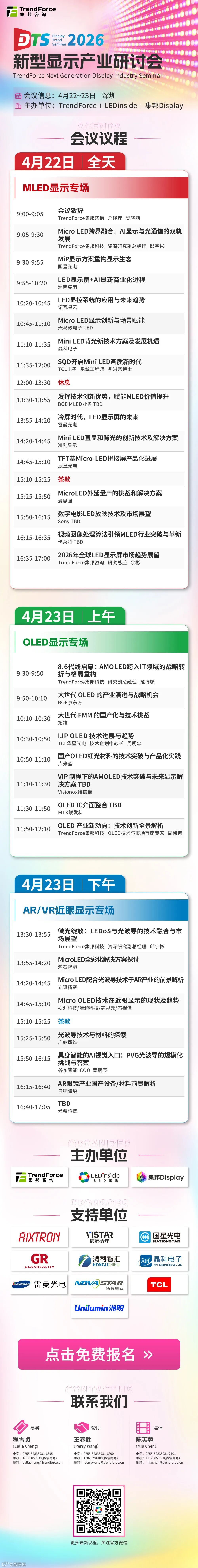 聚焦这一趋势,TrendForce集邦咨询拟于4月22日-23日重磅举办2026新型显示产业研讨会(DTS 2026)。其中在4月22日的MLED新型显示专场高阶会议上,资深专家与行业顶级分析师将齐聚一堂,雷曼光电也将带来《冷屏时代,LED显示屏的未来》主题演讲,共话技术与产业未来,诚邀各界报名参与。