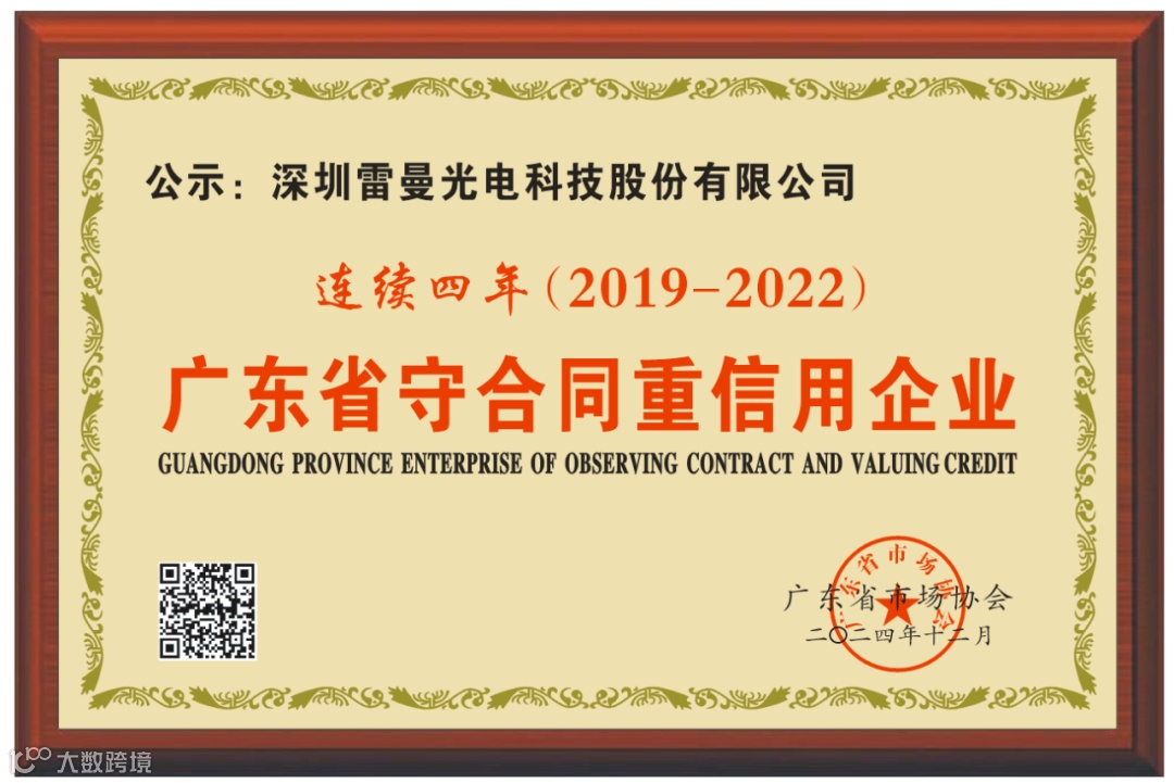 近日,广东省市场协会授予雷曼光电广东省“守合同重信用企业”荣誉称号,以表彰公司在守信经营方面的突出表现。雷曼光电依靠自身卓越的社会信誉和综合实力,已连续四年获评“广东省守合同重信用企业”称号,这是雷曼光电坚持守法经营、深入推动诚信合作所取得的成果。