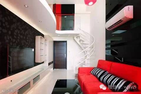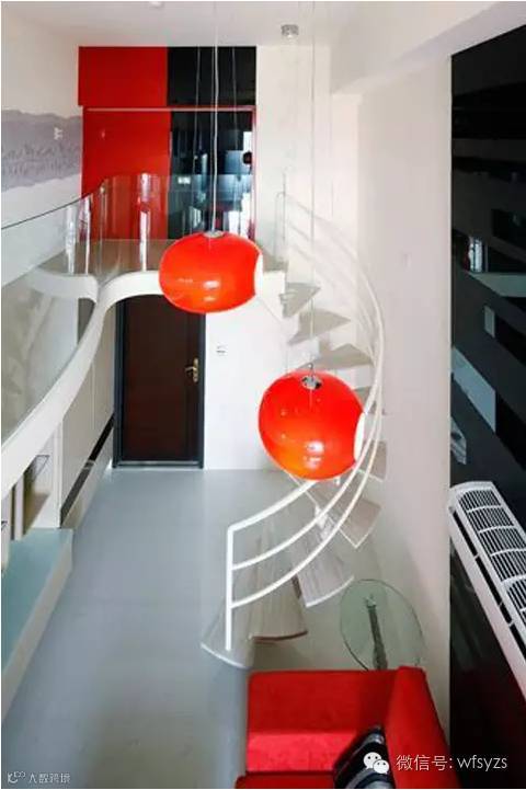 在挑高的格局里,设计师以造型单纯,颜色亮丽的吊灯灯饰做空间主角,藉由黑、白、红的颜色做张力表现,弧线的收边及造型处理,放大了空间的使用,也给予温和而开阔的视觉意象。
